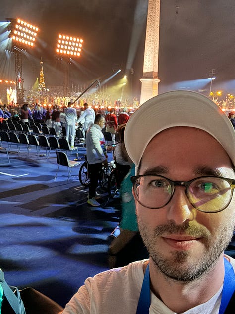 For me, the ceremony was emotional. It’s the start of something special, but also the culmination of 10+ years of work at the USOPC, IPC, and now UCI, celebrated by the world. The moment that stands out most was seeing all the athletes standing on the Champs-Élysées lined up with the Arc de Triomphe in the background, with the Agitos on it. Really, truly amazing for the Games, the growth of parasport, and the work the Paris 2024 team has done to change its city and country. After the parade of nations, the ceremony includes a number of performances and features about key athletes. Speeches are given by IPC President Andrew Parsons and Paris 2024 President Tony Estanguet. I found Tony’s speeches at both the Olympics and Paralympics to be some of the most authentic and genuine ceremony openings of all time. His work and what he spoke about were evident throughout the culture of the Paris 2024 organizing committee. It takes a true leader to create something like that with an organization as big as Paris 2024. After the speeches conclude, President Macron officially opens the games.